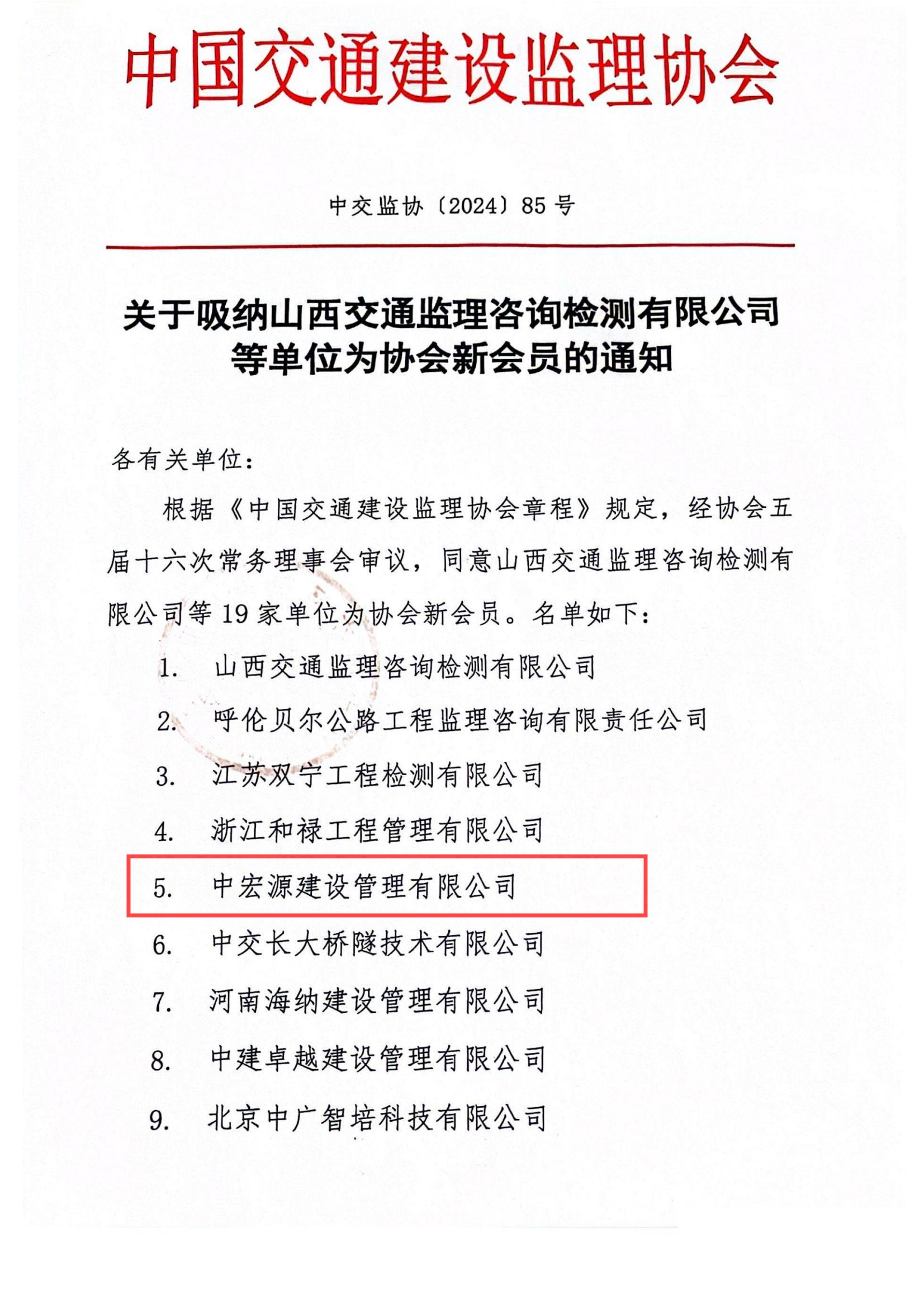 近日,中國交通建設監理協會發布官方文件,宣布接納19家單位為協會新會員,中宏源建設管理有限公司名列其中,正式成為中國交通建設監理協會的一份子。