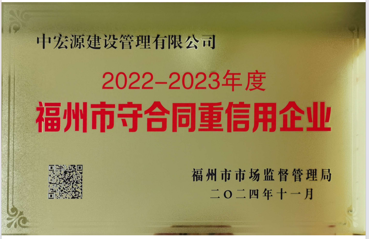 喜報|中宏源建設管理有限公司榮獲 “2022 - 2023年度福州市守合同重信用企業”稱號