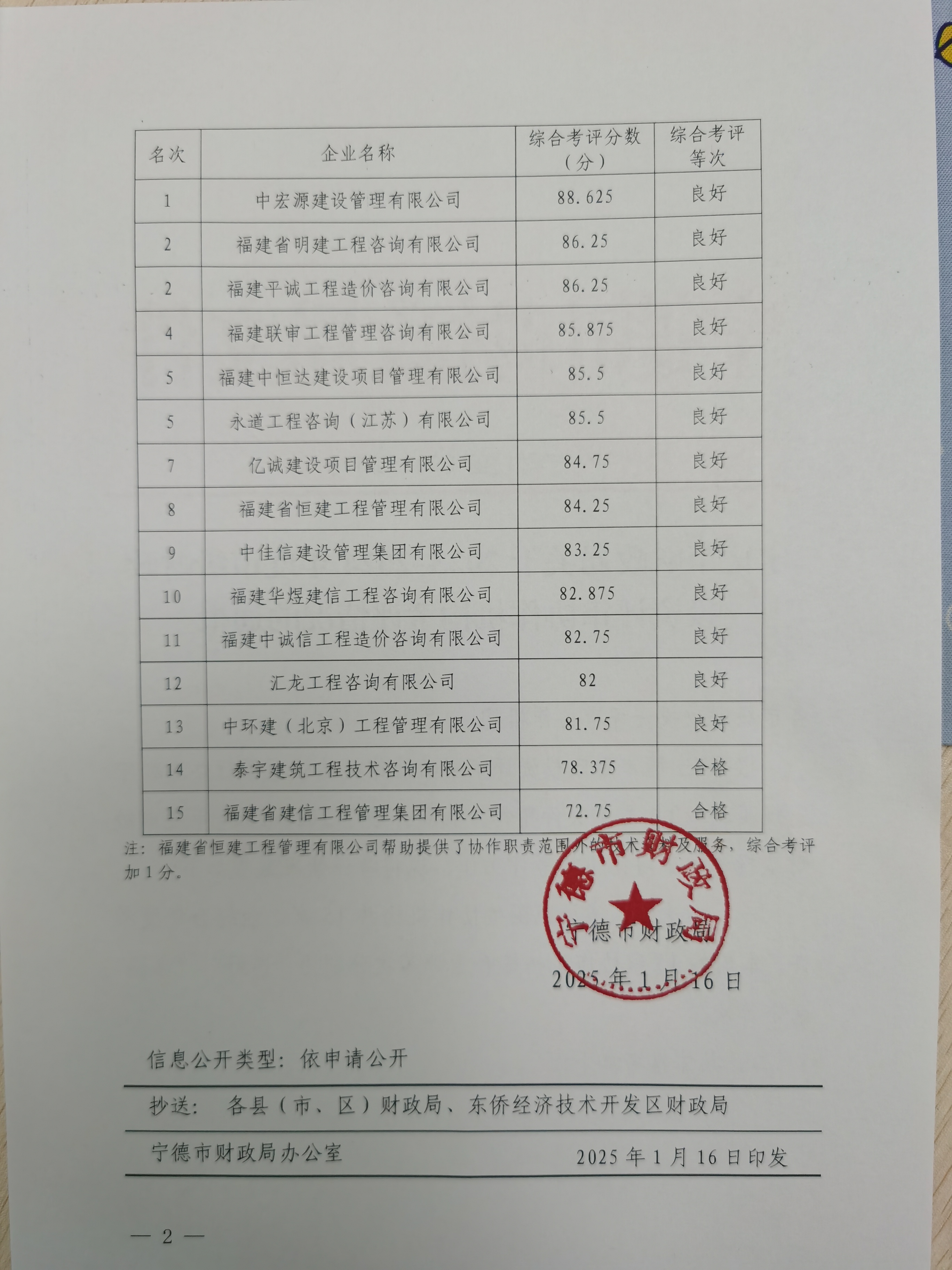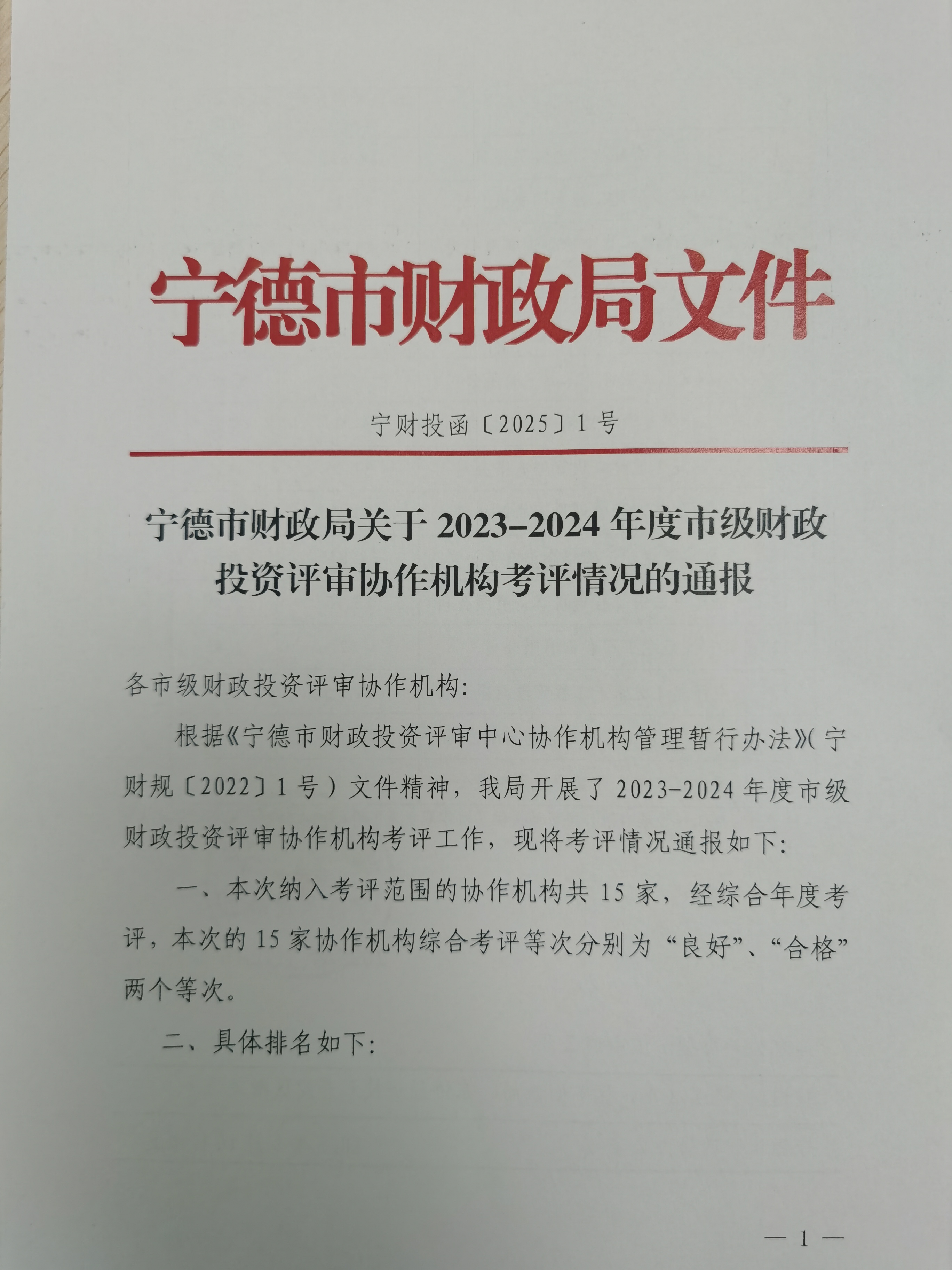 熱烈祝賀中宏源建設管理有限公司在寧德市財政局2023 - 2024年度市級財政投資評審協作機構考評中斬獲第一名!這一殊榮的獲得,是公司發展歷程中的重要里程碑,更是公司全體人員共同努力的結果。