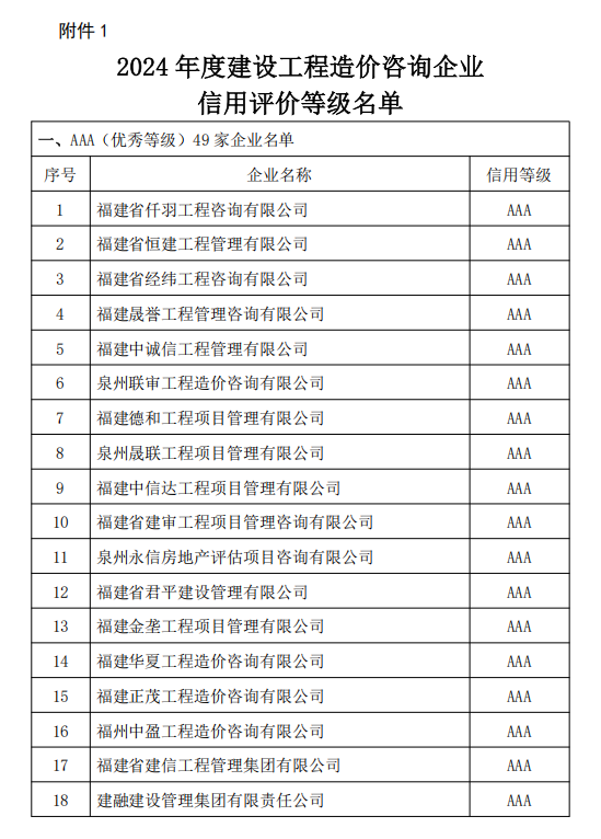 近日,泉州市住房和城鄉(xiāng)建設局公布了《2024年度造價咨詢企業(yè)信用評價等級及連續(xù)3年被評為AAA級企業(yè)名單》,中宏源建設管理有限公司憑借卓越的服務質(zhì)量、規(guī)范的管理體系和良好的市場信譽,再次榮獲AAA級信用評價,并成功入選“連續(xù)3年被評為AAA級企業(yè)”名單。