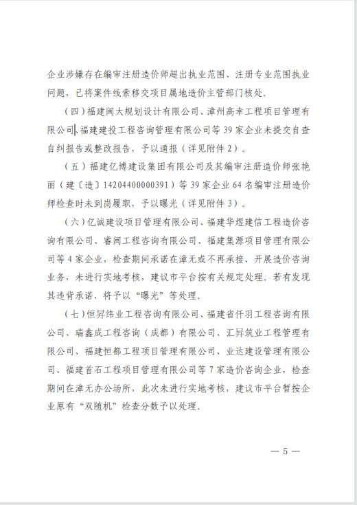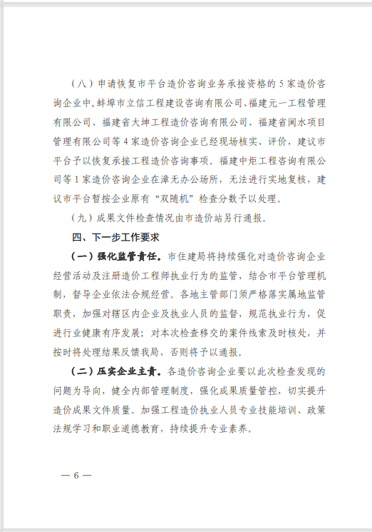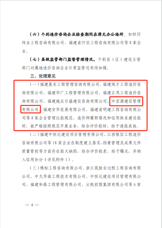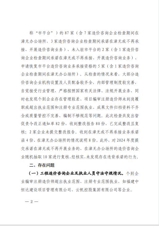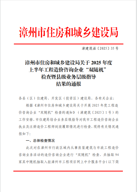 近日,漳州市住房和城鄉建設局完成2025年度上半年工程造價咨詢企業“雙隨機”檢查暨縣級業務層級指導工作,對在漳州市行政區域內從事房屋建筑與市政工程造價咨詢業務活動的94家企業進行了檢查。中宏源建設管理有限公司憑借在多方面的出色表現,得到了通報表揚。